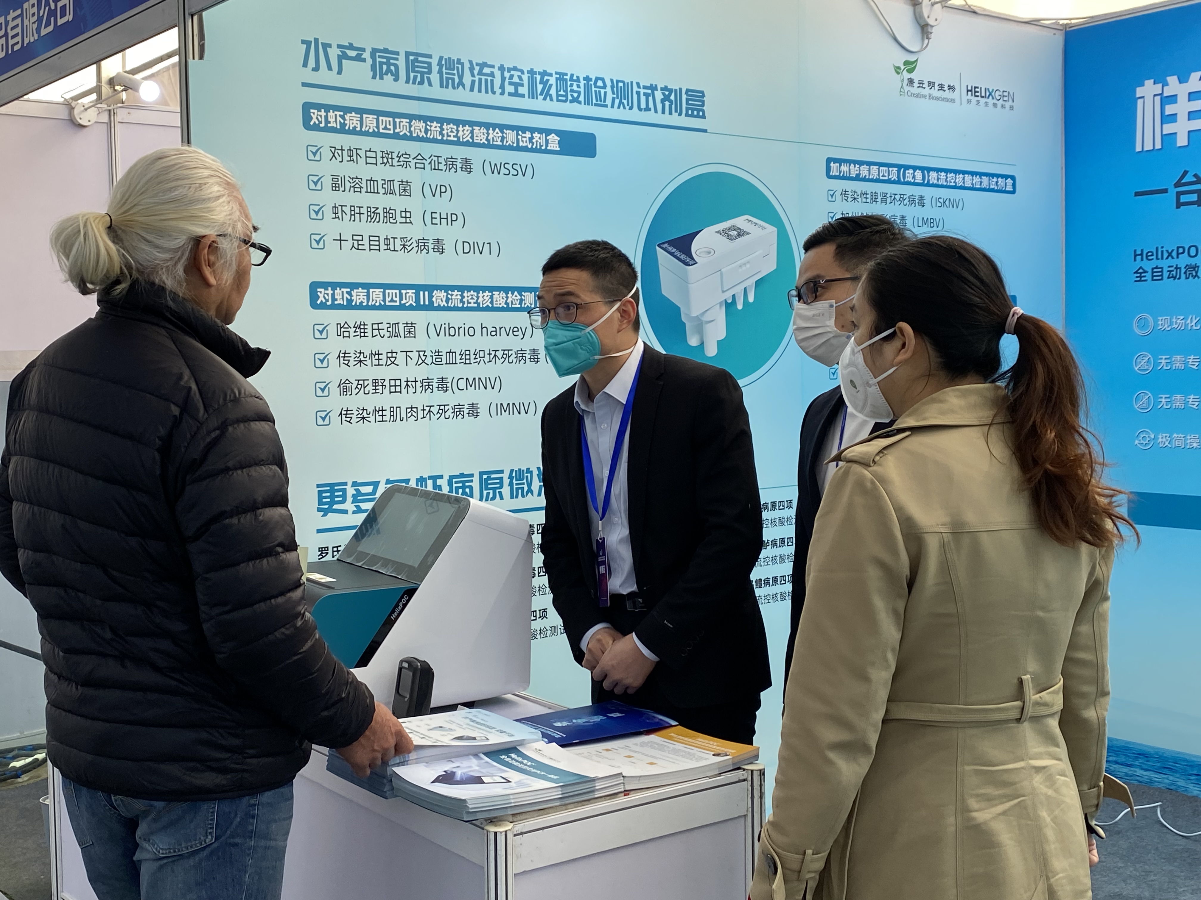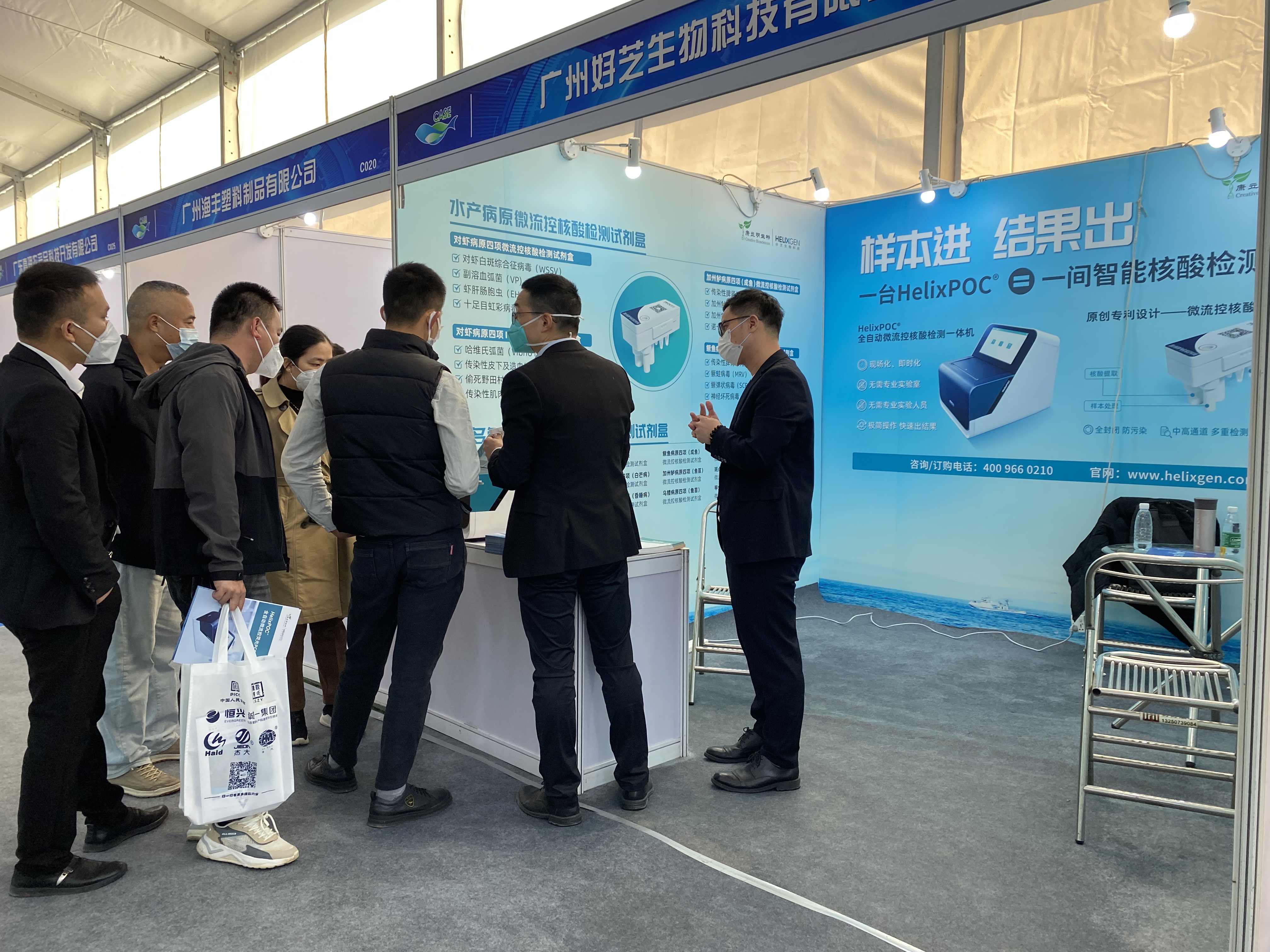 本次展會(huì),康立明生物全資子公司好芝生物攜帶HelixPOC®全自動(dòng)微流控?zé)晒?/span>PCR一體機(jī)及HelixPOC®水產(chǎn)病原微流控核酸檢測(cè)試劑盒赴展。