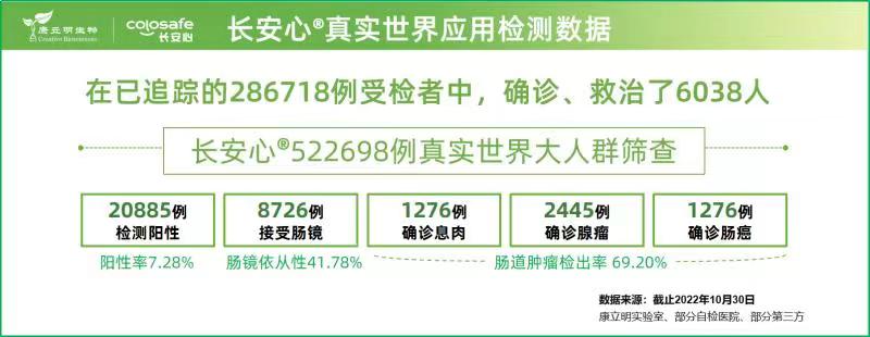 作為持續(xù)披露真實(shí)世界應(yīng)用數(shù)據(jù)的腸癌糞便基因檢測(cè)產(chǎn)品長(zhǎng)安心®,截至2022年10月30日,共完成522698例前瞻性應(yīng)用檢測(cè),其中286718例應(yīng)用數(shù)據(jù)可追溯,20885例受檢者長(zhǎng)安心檢測(cè)結(jié)果陽性(陽性率7.28%),其中8726例陽性檢測(cè)結(jié)果的受檢者進(jìn)行了腸鏡復(fù)查(腸鏡依從性41.78%),有6038例受檢者接受了確診與救治,其中1276例腸癌,2445例腺瘤,1276例息肉。