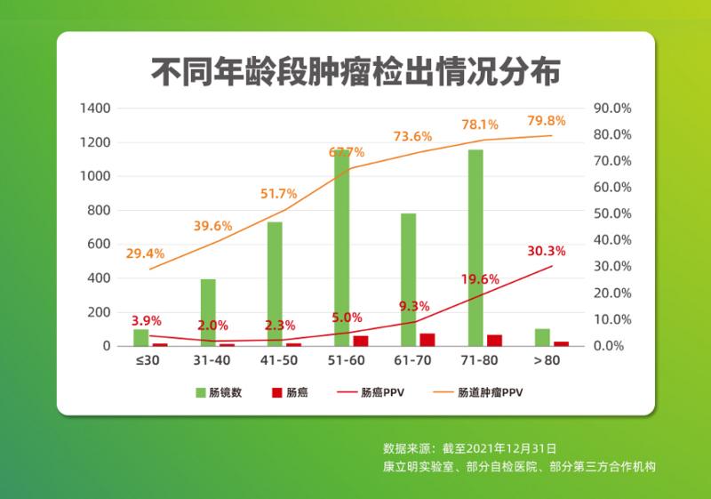 截至2021年12月,長安心®共完成33萬例前瞻性篩查,其中175528例篩查數(shù)據(jù)可追溯,12114例受檢者長安心®檢測結(jié)果陽性(陽性率6.9%),其中4970例長安心®檢測結(jié)果陽性的受檢者進行了腸鏡復查(腸鏡依從性41.0%),一共發(fā)現(xiàn)3408例需要治療的受檢者,其中755例腸癌,1444例腺瘤,1209例息肉。長安心®對腸道腫瘤的陽性預測值(PPV)為68.6%(其中腸癌的陽性預測值為15.2%)。
